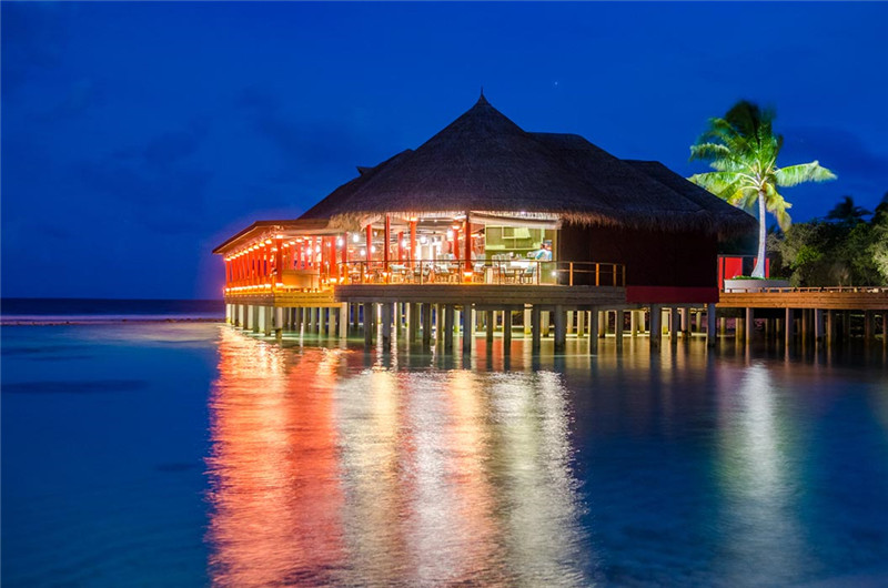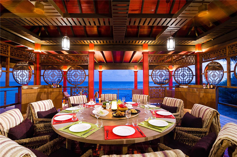 这里的招牌菜是黑松露明炉烤鸭片蘸Kanusan特制酱、经典亚洲风味的烤鸭、还有新鲜的龙虾任你挑选、新鲜的特色蓝鲍鱼等。这里可以同时容纳60名客人,设有一个全新的水上酒吧区和两个用餐区。值得一提的是,这座餐厅还专门设有蜜月晚餐,来这里度蜜月的朋友可以体验一下。