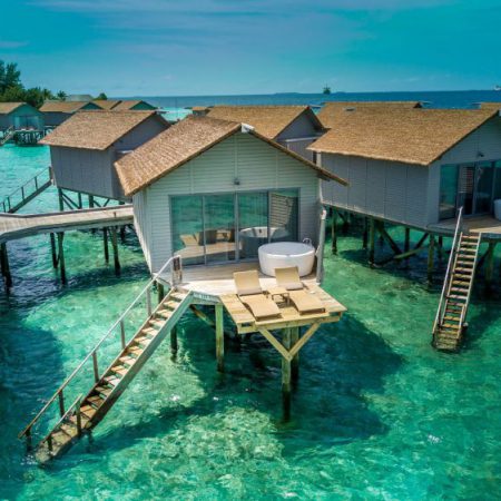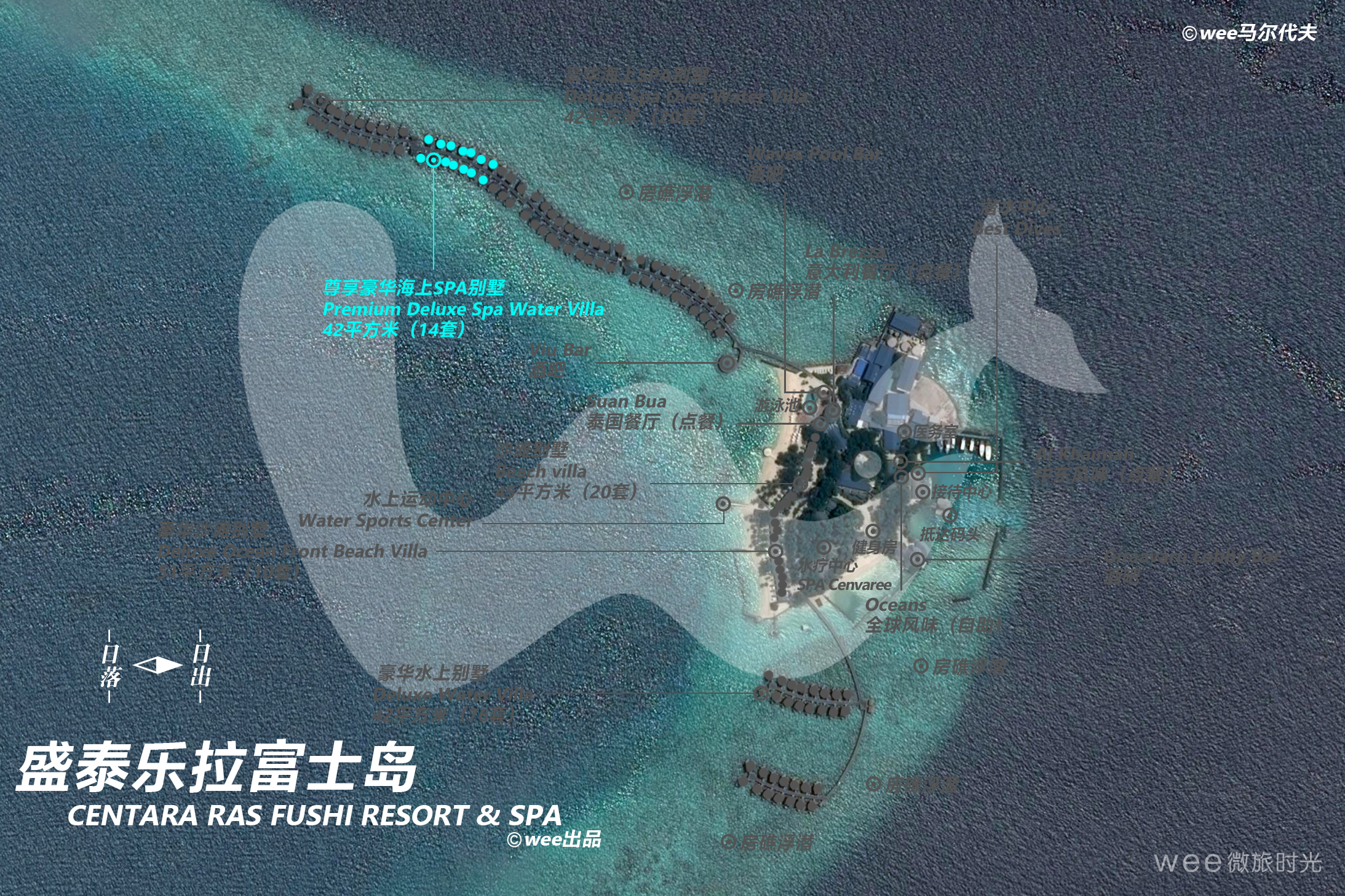 远离尘嚣,进入世外桃源,在此可惬意沉浸在和煦的日光浴中,远眺令人心旷神怡的海景,享受潜水之趣,也可以放松于室外水疗浴缸并观赏海洋全景。一共设有14间尊享豪华Spa水上别墅,提供42平方米起居空间且包含露天阳台,配有特大双人床,可直接跃入环礁湖畅游一番。