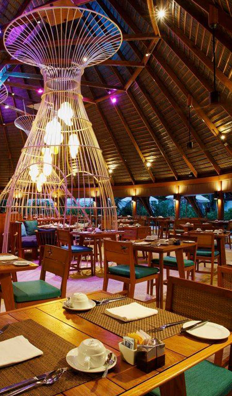 酒店根据马尔代夫传统风格建造,坐落于岛屿中心,供应每日更新的自助餐点,菜品融合了丰富的异国美食风格如:亚洲、欧洲、中东及南美洲料理;别有风味的巴西烤肉更是餐厅的一大特色。