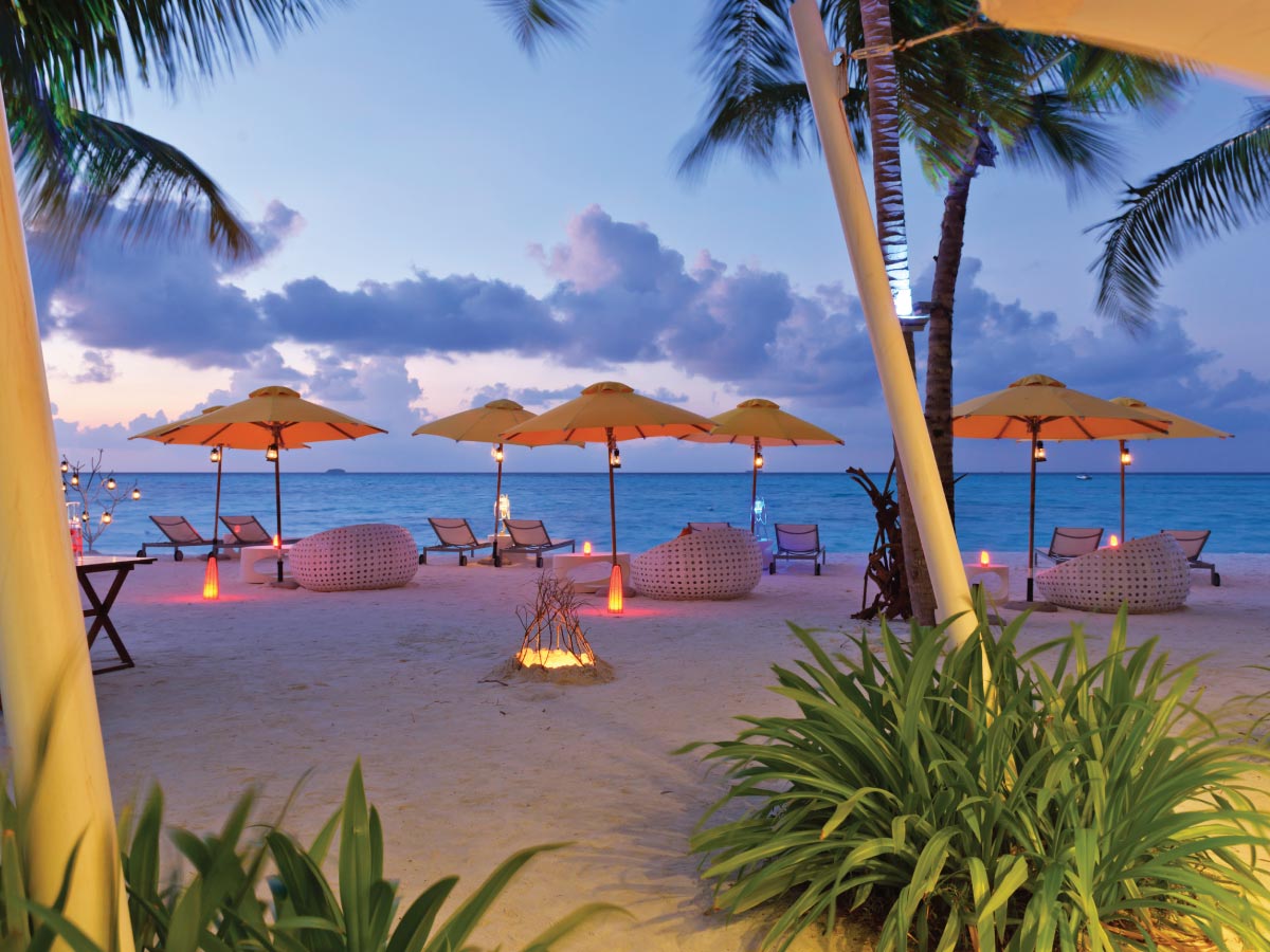 白色沙滩上的休闲用餐。坐在宽大的懒人沙发里喝杯鸡尾酒,漂浮的云彩就是你的屋顶。随着夜幕降临,海滩酒吧里开始热闹起来,透过海风传来DJ的精彩节拍。