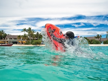 透过玻璃底的皮划艇,凝望碧蓝的海水。驾驶水下摩托艇以每小时20公里的速度在水下疾驰,再冲出水面。在海岛尾部冲浪,那里是中高级潜水者的完美地点。
