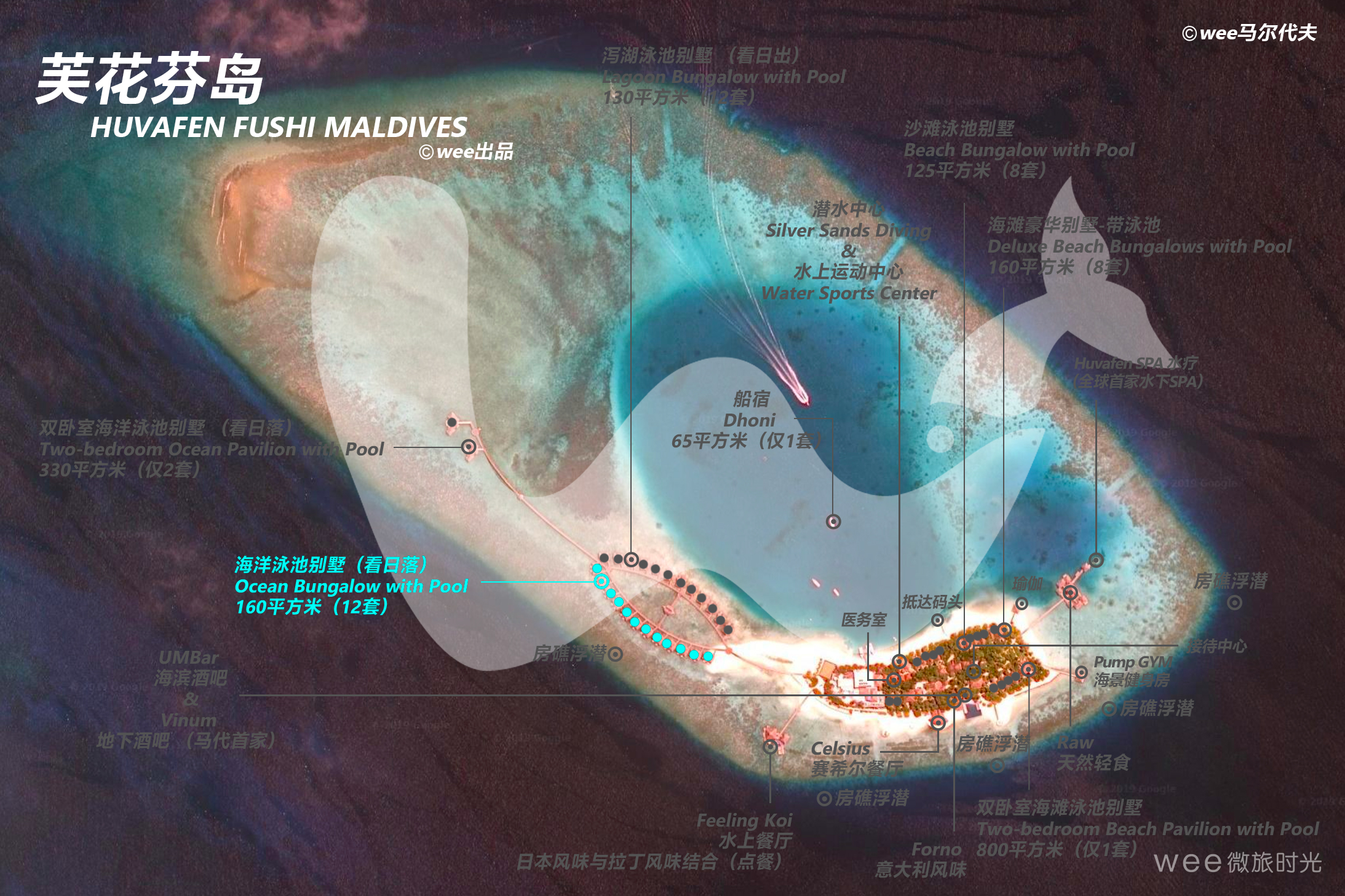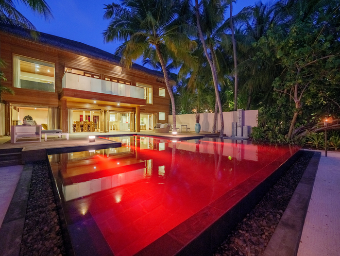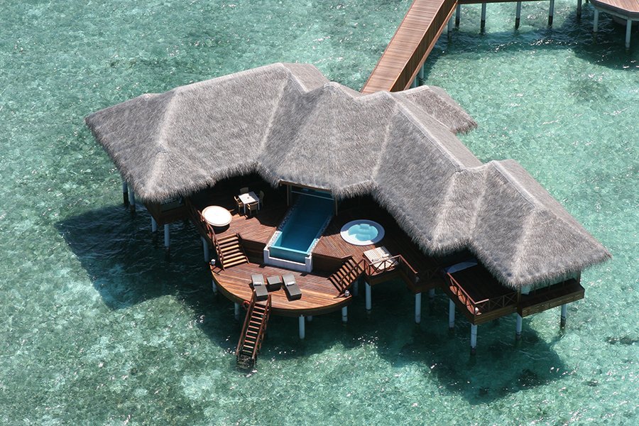 广阔的印度洋在这栋简易别墅前扩建。三层甲板,无与伦比的景色。露台共三层,除无边游泳池和用餐区外,还有休憩的坐卧两用沙发和日光浴平台。起居室配有最先进的影院系统,在房间内专门安装了玻璃地板,常常能够看到鱼儿在脚底下游来游去。在客房的浴室中均为超大型圆形按摩浴缸,在此洗澡实为一种享受。房间里的大型观景窗亦能够让人随时随地跟美景做伴。
