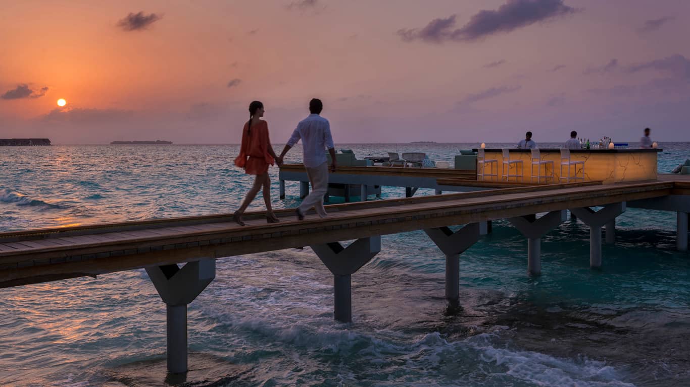 餐厅坐落在岛屿北岸礁湖水面上,沿着海岸悠闲漫步,驻足马尔代夫宁静舒适的露天平台之一,Seabar 酒吧,这里有柔软、舒适的座椅,可以一边欣赏脚下的柠檬鲨和珊瑚鱼在碧蓝色的海水中自在遨游,一边品尝特色冰镇玛格丽塔鸡尾酒以及各式美味餐前小吃。