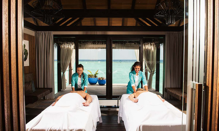 维拉岛的水疗中心坐落于岛屿最东边的海面上,和香槟酒吧一样,都是由一个架设在海面上的木质板桥链接,环境幽雅、宁静,充分地保证了游客的隐私。提供手法专一的水疗体验,以及融合了中西方多种不同的按摩手法,所有的护理产品也都追求天然的健康理念,志在为游客提供舒适且完美的身心享受。