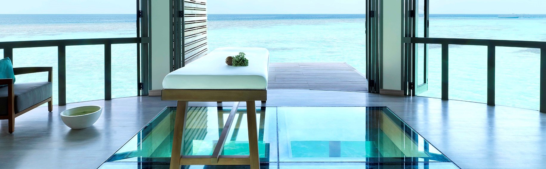 水疗中心设有四间情侣海景护理室,八间单人护理室,美甲沙龙,水疗精品店和户外休闲区。