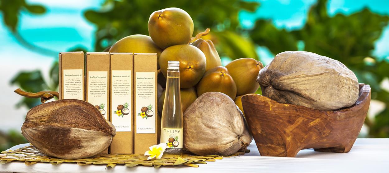 马尔代夫自制椰子油采用岛上新鲜椰子为原料,由泰丽丝水疗中心团队精心加工而成。每个周五,泰丽丝水疗中心都将向宾客现场示范如何以马尔代夫传统工艺制作纯椰子油,还能品尝椰子。精心制作的纯椰子油不仅被用于泰丽丝水疗中心的招牌护理项目中,而且还单独有售。
