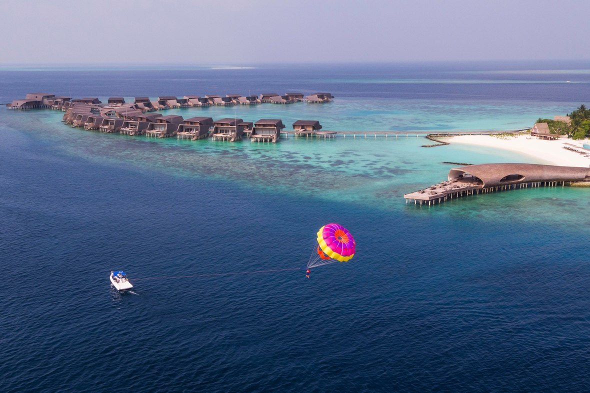穿过清新的马尔代夫空气,搭乘滑翔伞,享受达哈鲁环礁风景如画的空中景色。