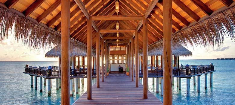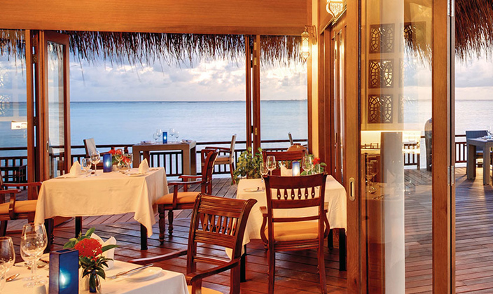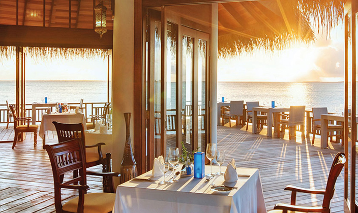 以浪漫和最佳的位置而闻名、矗立在蓝色珊瑚上的露天阳台——Samsara餐厅提供给客人宁静的环境和精致的菜肴,其菜式融合了泰国,印度和日本风味,餐厅中间通过一个狭长的栈道和主岛连接,是欣赏日落的最佳位置,餐厅里除了供应东南亚美食外,还提供美味可口的铁板烧菜肴。