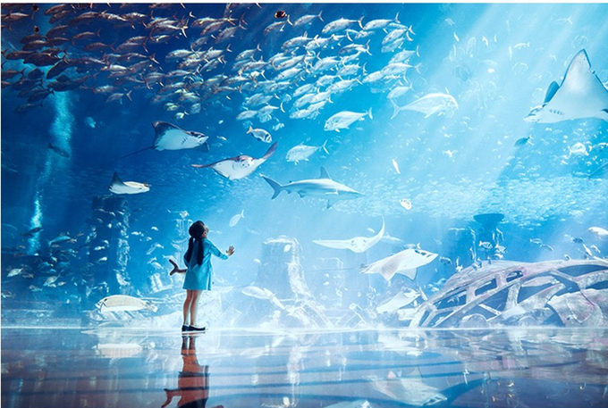 ★在超震撼的巨型观赏幕墙前打卡,玻璃里的鲨鱼、魔鬼鱼,清晰得就像在眼前,好像进入了海底世界!