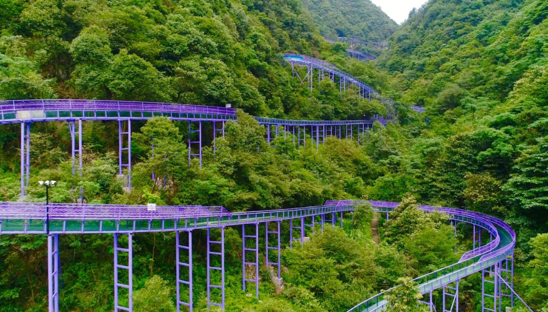 天子地紫龙峡玻璃水滑道是由大齐旅游设计承建的,在设计之初,考虑到景区的具体要求,依据山体走势,建设了这条国内最长的紫色空中玻璃滑漂。