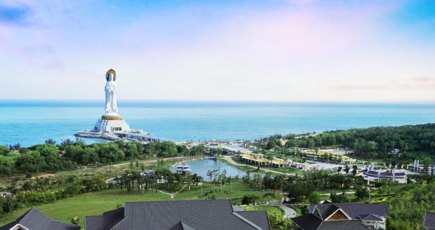 南海观音立像位于普陀山风景名胜区之东南的龙湾岗巅。这一尊南海观音立像总高33米,其中台基高13米,铜像高18米,莲花座为2米,重70多吨。佛像基层是面积1000多平方的功德厅,上层供奉500尊形态各异的观音铜像,下层大厅饰有观音灵异故事的大型黄杨木雕和以普陀山风景名胜区景色为题材的彩玉浮雕。