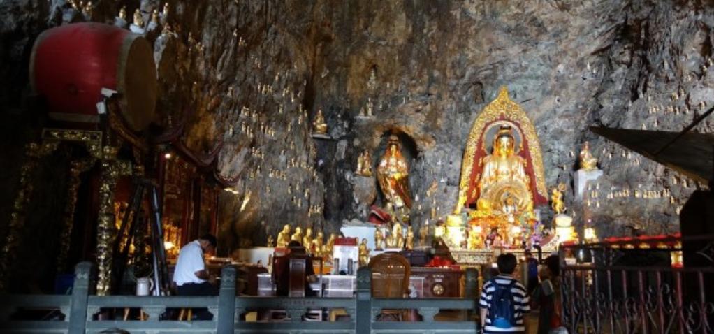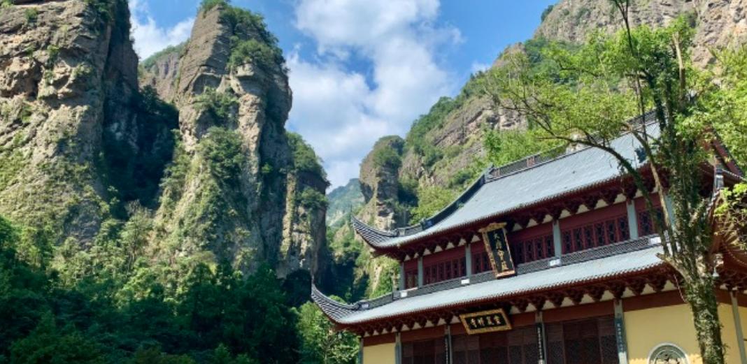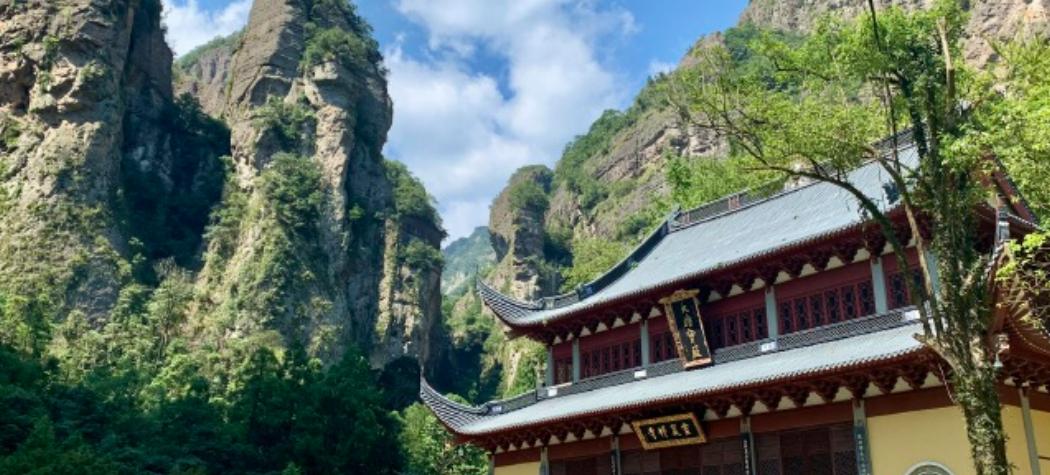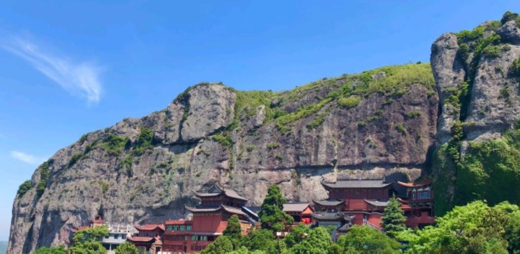 为雁荡山第一洞天。进入山门即见天王殿,从山脚要经历403 级逶迤石磴,才达顶层大殿。洞顶有泉水三束,名洗心、漱玉、石釜。 仰望洞顶,中开一小罅,有一线天光泻下,名叫一线天。