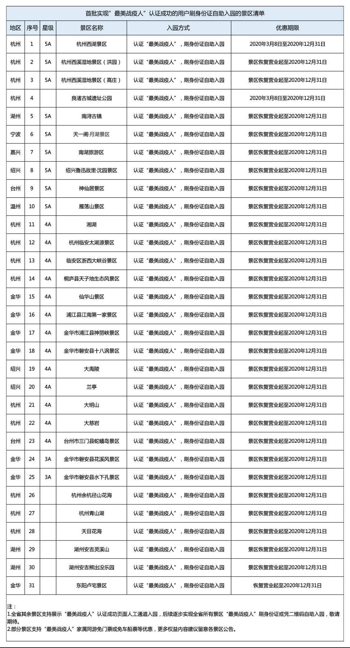 2020浙江省国有旅游景区对医务人员免费一年政策。