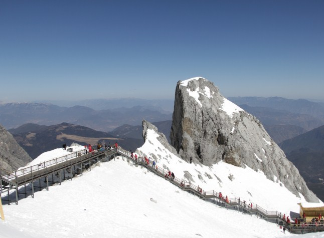 玉龙雪山,位于云南省丽江市境内雪山群,5A级旅游景区。玉龙雪山是北半球最近赤道终年积雪的山脉,隔江西与中甸雪山、东与绵绵山相并列,北自三江口,向南延伸到北纬27°,如扇面向古城展开。全山的13座山峰由南向北纵向排列,主峰扇子陡最高处海拔5596米,终年积雪,发育有亚欧大陆距离赤道最近的温带海洋性冰川。玉龙雪山在纳西语中被称为“欧鲁”,意为“天山”,是纳西人的神山,传说纳西族保护神“三多”的化身。