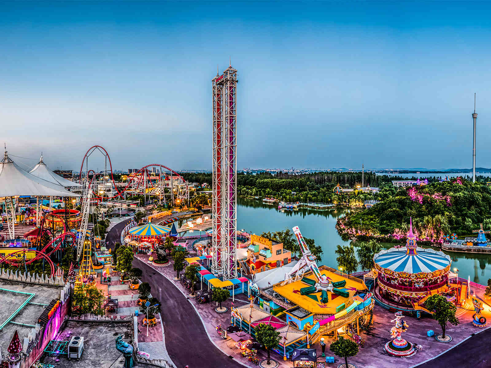 经典项目有:木翼双龙、极速飞车、摩天塔、蒙地卡罗赛道、太阳神车、完美风暴、天地双雄、8、激流度勇进、魔力特快、凤舞九天、野人谷漂流、4D影院。门票价格180元/人。其由欢乐江城、飓风湾、梦想大道、极速世界、渔光岛、卡通工厂、欢乐时光、羽落天堂等八大主题区域组成。