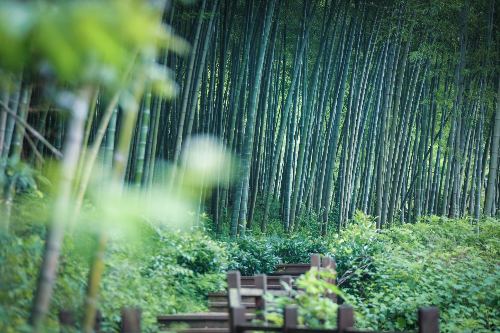 在竹海中,两山夹峙之间,山涧水和天然雨水汇集成了小小的“镜湖”,面积3万平方米,蓄水量15万立方米,最深处10米。湖水终年清冽,竹在水中长,水在竹间流,镜湖与绵延的竹海相映。