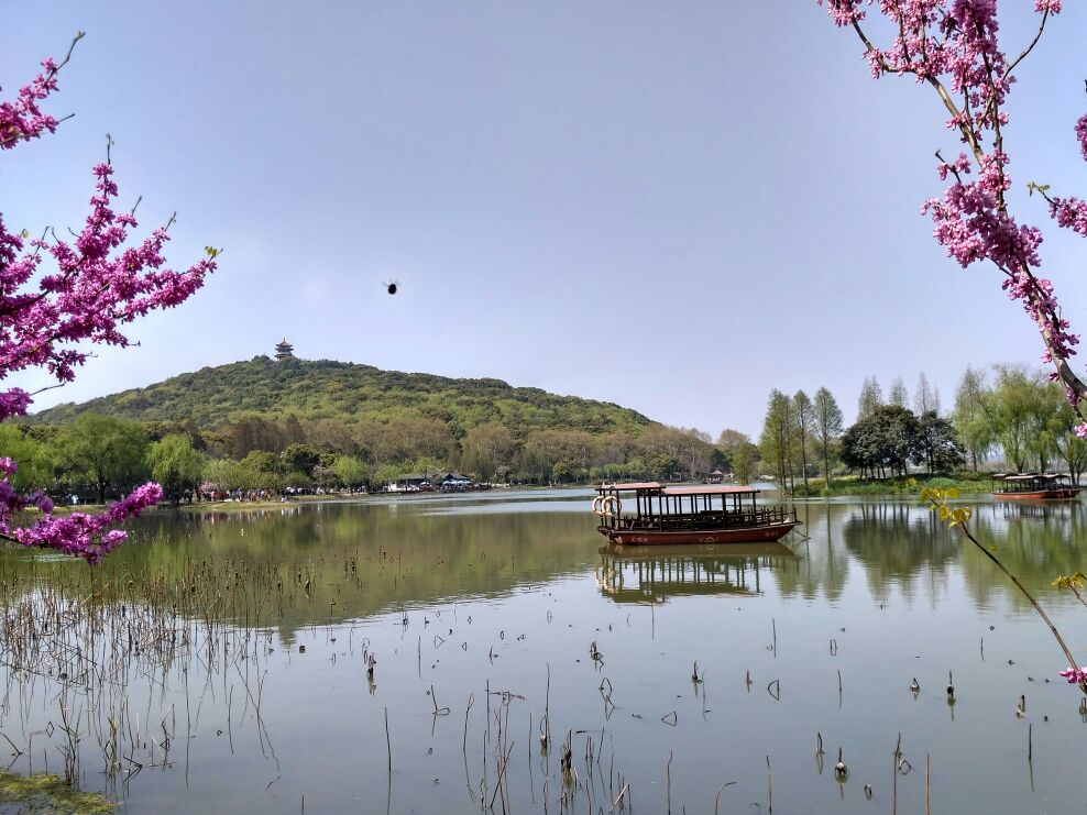 这一堤的樱花树一侧是小巧精致的池塘,每年樱花季的末尾,池水上飘满了樱花花瓣,一池碧水半池粉红,配着江南古风的长春桥,美轮美奂。另一侧是烟波浩渺的太湖,日出之前还可以看见一轮明月悬挂于三山仙岛之上,透过纷繁的花枝,就是一幅春江花月夜的景色