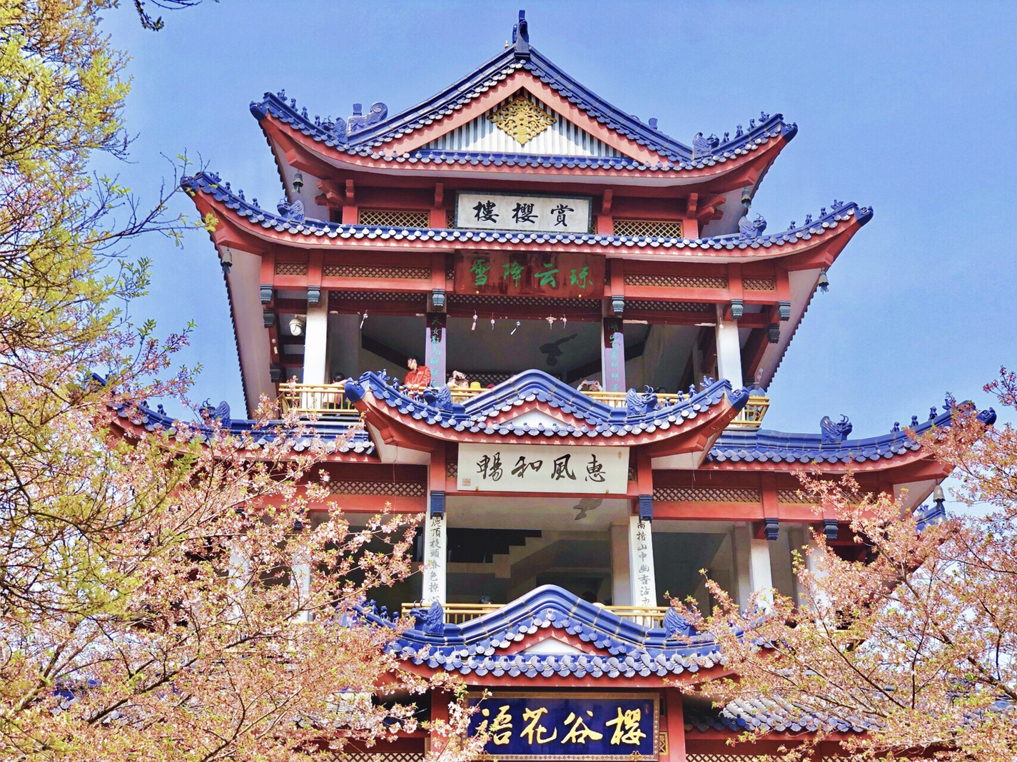 赏樱阁位于鼋头渚樱花林核心地带,是樱花林内标志性建筑景观,登临赏樱阁,居高临下,眺目四望,漫山遍野樱花花海,是鼋头渚风景区内的最佳赏樱胜境。