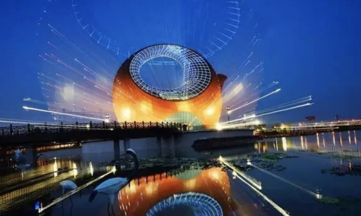 世界上最大的紫砂壶,如此标志性的建筑,最美夜景怎么能没有它呢。紫砂壶造型的建筑高度达38.8米、直径近50米、面积5000平方米,已经获得吉尼斯世界纪录。