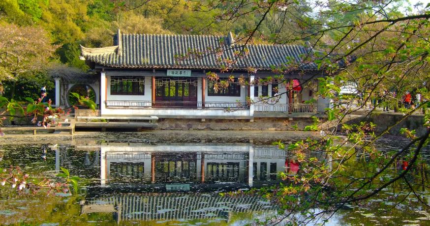 一边是鹿顶山,一边是五里湖和种植了樱花、杨柳的湖堤。从十里芳径行走,一步一景,几株樱花,隔着丝丝翠柳,红白相间的樱花朵朵,与嫩绿的杨柳,加上碧水蓝天,造就了一幅诗情画意的春意图。