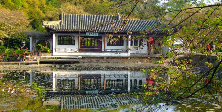 十里芳径(樱花翠柳两相宜)一边是鹿顶山,一边是五里湖和种植了樱花、杨柳的湖堤。从十里芳径行走,一步一景,几株樱花,隔着丝丝翠柳,红白相间的樱花朵朵,与嫩绿的杨柳,加上碧水蓝天,造就了一幅诗情画意的春意图。