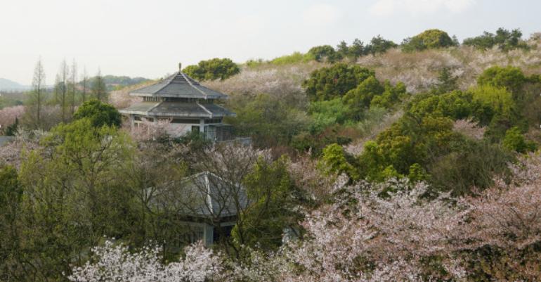 赏樱阁位于鼋头渚樱花林核心地带,是樱花林内标志性建筑景观,登临赏樱阁,居高临下,眺目四望,漫山遍野樱花花海,是鼋头渚风景区内的最佳赏樱胜境。