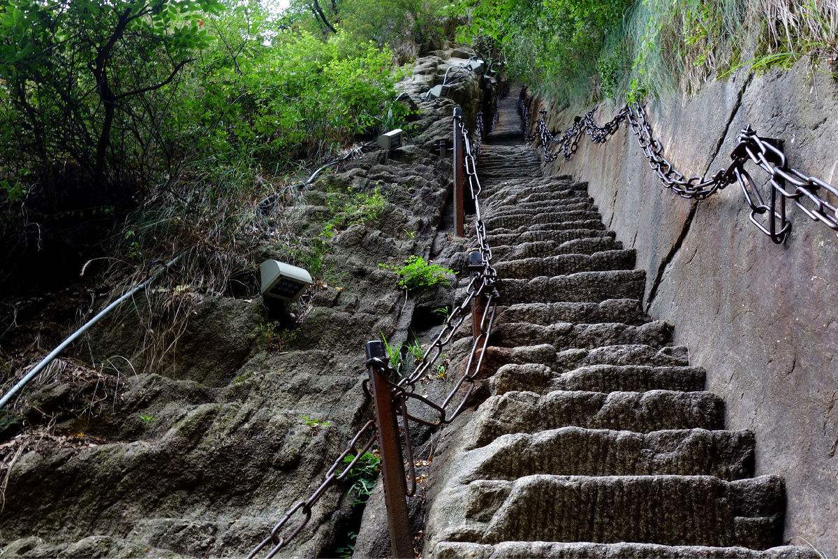 千尺幢位于回心石之上,是华山第一险境。山幢壁直立,其间仅容二人上下穿行。两边铁链垂直下垂,坡度为70°。从上到下共有370多个台阶,皆不满足宽。