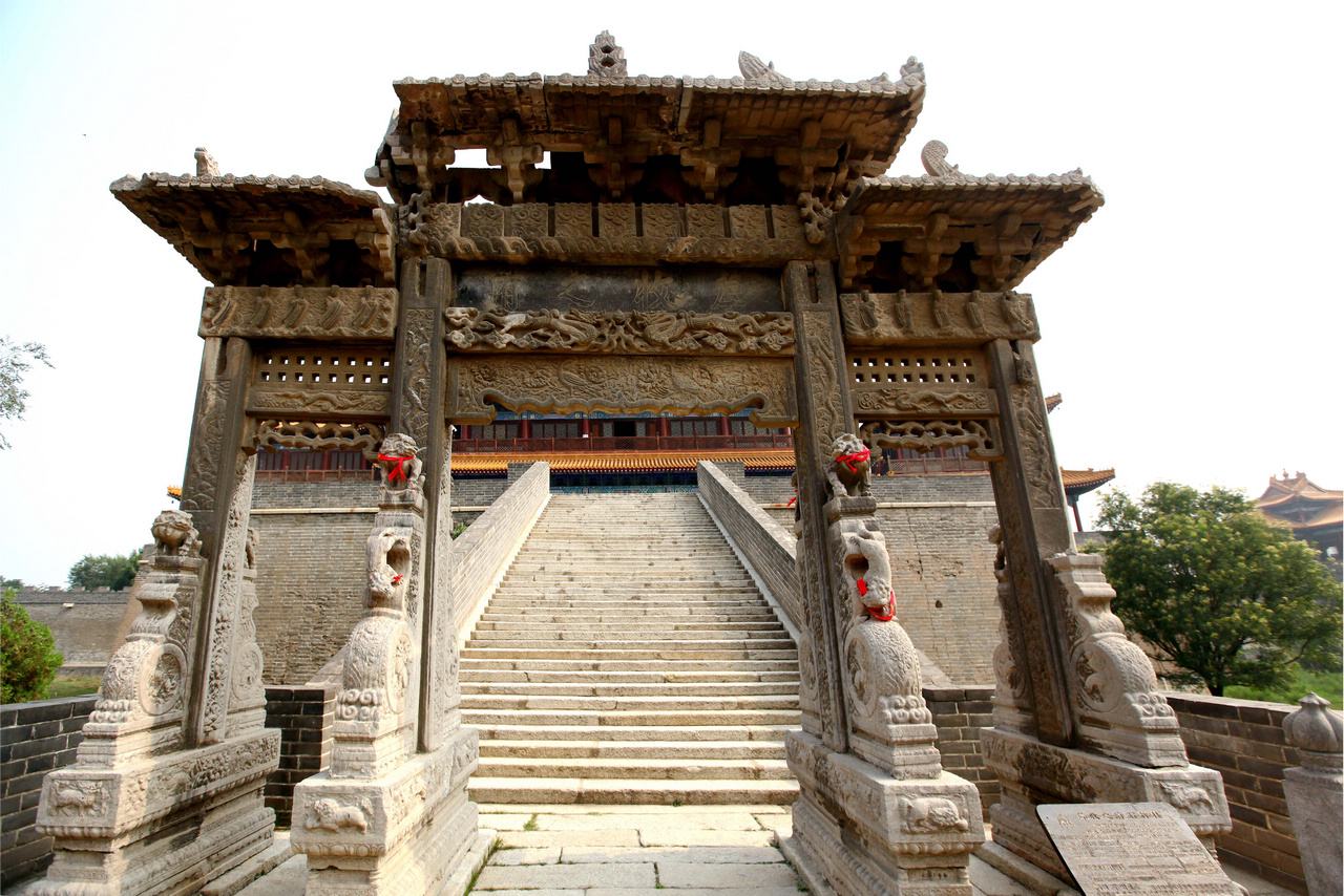 西岳庙建筑相当宏伟。五凤楼建于高台上,高达20多米,登楼望华山,五峰历历在目。正殿灏灵殿建筑为琉璃瓦单檐歇山顶,坐落于宽广的“凸”字型月台之上,面宽7间,进深5间,周围有回廊,气势宏伟,历代帝王祭祀华山多住于此。
