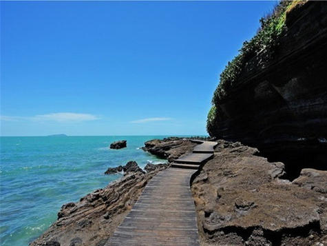 海蚀景观:沿岸悬崖峭壁,坡陡水深,形成海蚀洞、海蚀沟、海蚀龛、海蚀崖、海蚀柱、海蚀窗、海蚀平台、海蚀蘑菇等千姿百态的海蚀地貌。