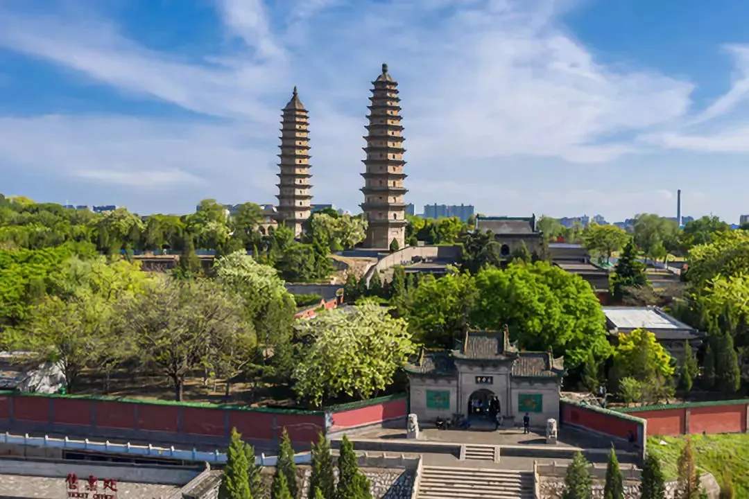 三晋名刹双塔寺,位于太原市城区东南方向,距市中心四公里左右的郝庄村南之向山脚畔。这里,绿树红墙,宝塔梵殿,龛阁玲珑,碑碣栉比,花卉溢香,松柏凝翠,肃穆幽静,古香古色