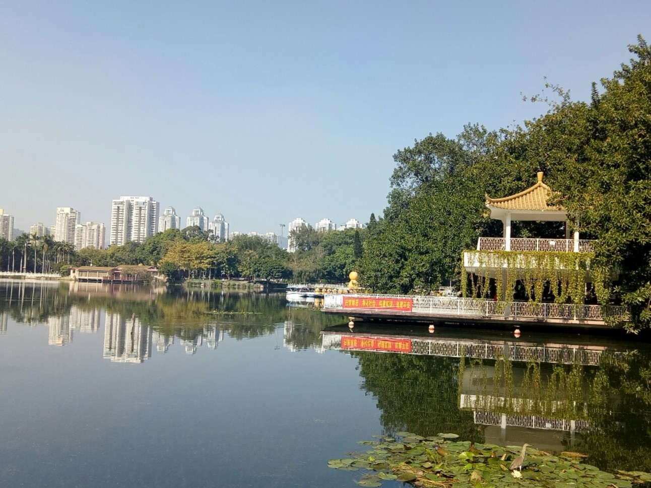 园内有10公顷的人工湖,又美称荔湖。人工湖经几次改造、提高,增建了揽月桥、音乐喷泉、激光水幕、绕湖的灯光夜景等。走过迎风醉月的揽月桥,也可望五曲桥、浸月桥、绕湖桥桥相通;到湖边邀月亭、掬月亭、凌波亭小坐,可静心欣赏湖中游艇老少同欢。