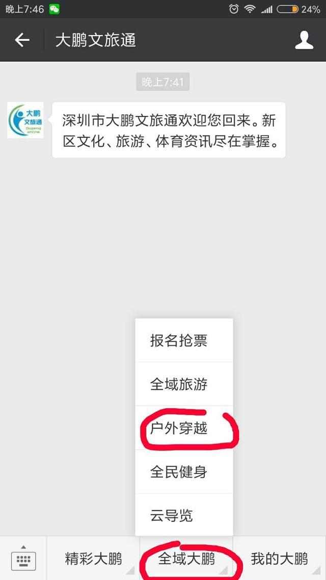 2、进入公众号页面,点击底部菜单“全域大鹏”,在上拉菜单中选择“户外穿越”,进入户外穿越页面。