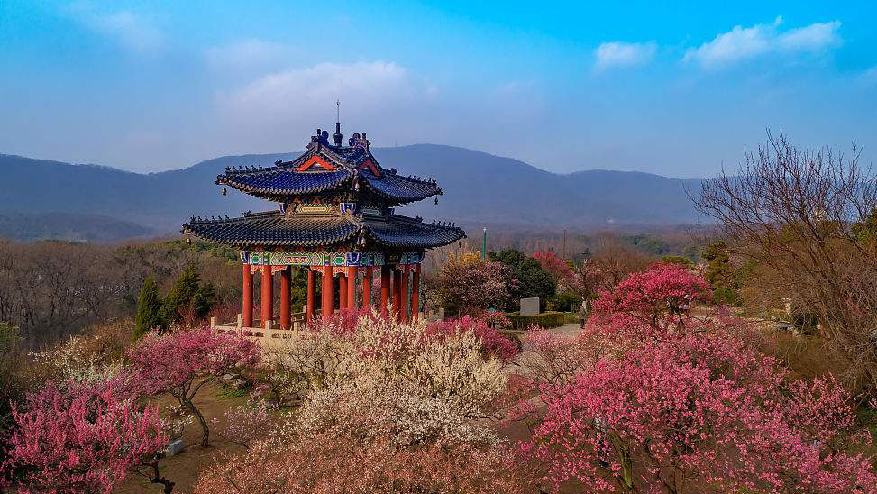 梅花山是中国南京东郊紫金山的一座小山丘,位于中山陵西南,明孝陵正南。山上遍植梅花,因此得名。梅花山以及山下的“万株梅园”占地1533余亩,整个梅花山有11个品种群,有近400个品种,35000余株梅树,有“梅花世界”之称,以品种奇特著称,为四大梅园之首,每年春季举办有“中国南京国际梅花节”。春初连日的升温、阴天、细雨,正适合梅花进入绽放期。无论从种植梅花的历史、规模、种类、数量,都堪称魁首,甚至不少人将南京梅花山成为“天下第一梅山”。