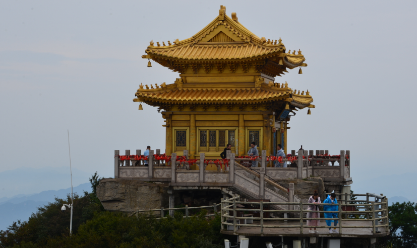 五母金殿海拔2173米,与亮宝台、玉皇顶呈三角之势,巧妙构成了二龙戏珠的壮观图案。不仅是观赏山景的绝佳之处,而且以其独特的造型,成为金顶道观群的画龙点睛之笔。五母金殿位于老君庙正北独峰,此峰被称为晒人场,即女娲娘娘创造人类的圣地,传说是女娲在这里用黄土捏人并创造了人类。山顶曾有一座娲皇殿,明末时,被雷电烧毁。随后重建,也就是现在大家所看到的金殿。