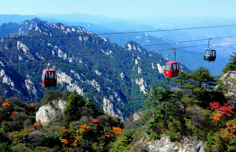 三、中灵索道中灵索道因上站至中天门,下站位于灵官殿东侧而得名“中灵”,2009年公司投资1.2亿从奥地利引进目前世界上最先进,速度最快的多贝玛亚索道,于2010年正式投入运营。单线全长2713.5米,14个支架,35个吊箱;每个吊箱可以同时乘坐8位游客,最高时速6米/秒,上山需要8—10分钟。