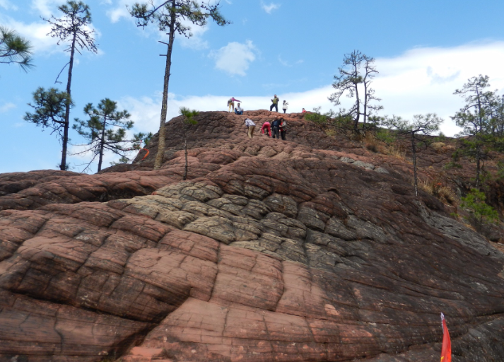 三、千龟山黎明千龟山,它位于丽江市的玉龙纳西族自治县黎明乡境内。在黎明村的西南部,存在有不少红色岩石表面风化形成的美丽的龟裂状(龟板、菠萝状)构造山体;其中一座山坡形如千万只小乌龟又组成一只大乌龟,排列得自然而且有序,仿佛向着太阳升起的东方正在不停地行进着;堪称黎明丹霞风光中的一绝,美仑而美奂。