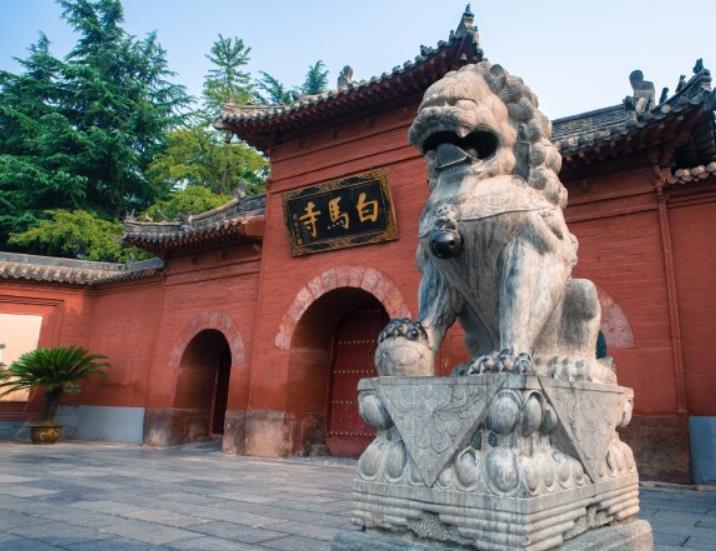 白马寺佛教传入中国后第一座由官府建造的寺院,有“中国第一古刹”之称。白马寺现存的遗址古迹为元、明、清时所留,均列于南北向的中轴线上。大雄宝殿是全寺主殿,其他主要建筑有天王殿、大佛殿、毗卢阁等。