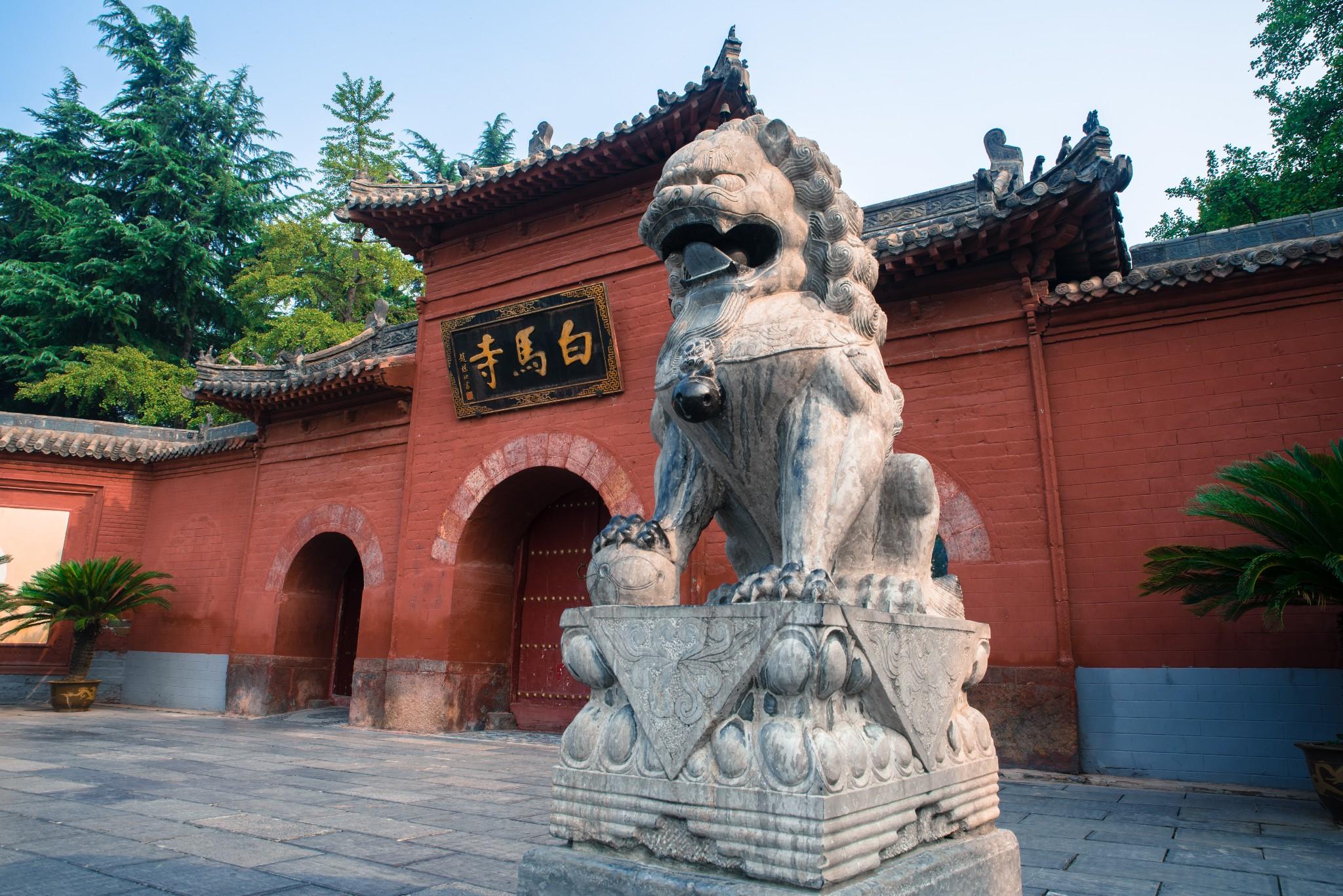 白马寺把佛教传到了朝鲜、日本和东南亚,使佛教在亚洲得到普及,后来又进入欧美,成为世界各地佛教信徒参拜的圣地。白马寺整个寺庙布局规整,风格古朴。寺大门之外,广场南有近些年新建石牌坊、放生池、石拱桥,其左右两侧为绿地。左右相对有两匹石马,大小和真马相当,形象温和驯良,这是两匹宋代的石雕马,身高1.75米,长2.20米,作低头负重状。