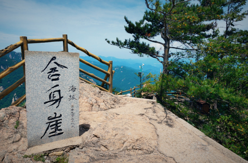 舍身崖是洛阳老君山山顶老君庙和伏牛山主峰的自然风光,站在垭口,翘首而望,看那古松摩云,危崖欲倾,确实雄伟壮观。每当日落之时,此处“余辉返照千山色,满峪参差人画中”,瑰丽的晚霞映着诡奇万状的险峰怪石,奇光异景,色彩缤纷,令人赞叹不已。