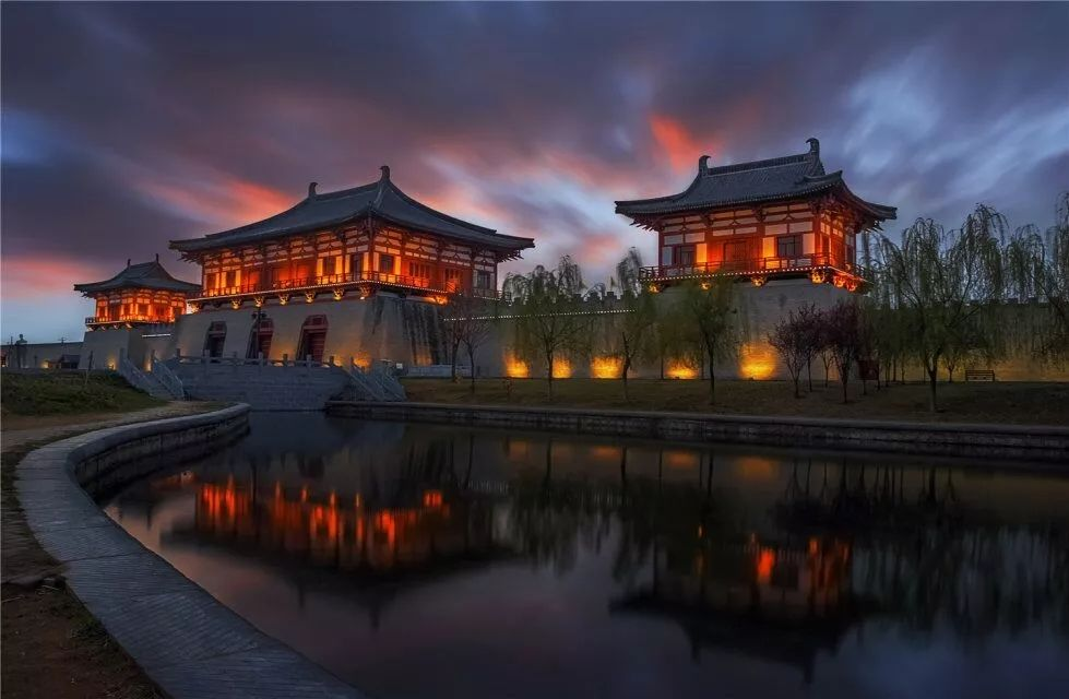 典型的隋唐建筑风格,朱红搭配着厚厚的城砖,在夜晚灯光的照耀下,竟是这样的让人沉醉,忍不住想要多拍几张,又怕自己的拍照技术配不上眼前这美景。