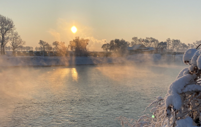 在吉林,每到冬季,尽管松花湖上一抹如镜、冰冻如铁,但冰层下面几十米深的水里仍能保持4℃的水温,水温和地面温差常在30℃左右,于是就形成了市区以下几十里不封冻的江面。温差使江水产生雾气,江面上白雾袅袅,久不消散。