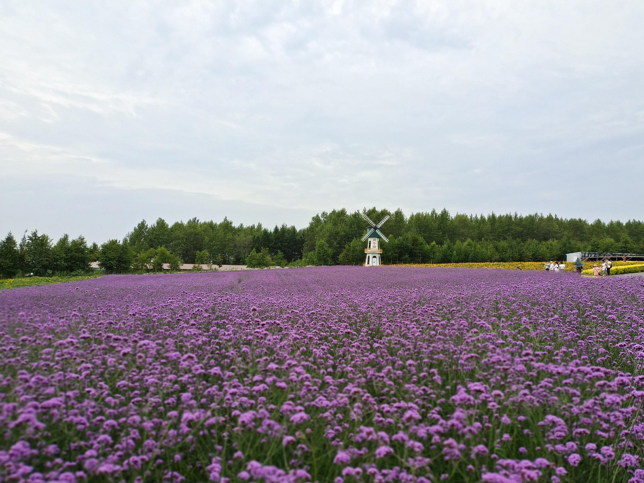 玫瑰、虞美人、美女樱、金盏菊、薰衣草等100余种花卉盛情绽放,缤纷的颜色铺满了整个山野湖中,一片紫色、一片红色,一片黄色,又一片彩色,层次感分明,处处散发着幽香,配上蔚蓝的天空,仿佛一幅色彩浓郁的油画铺到天边。