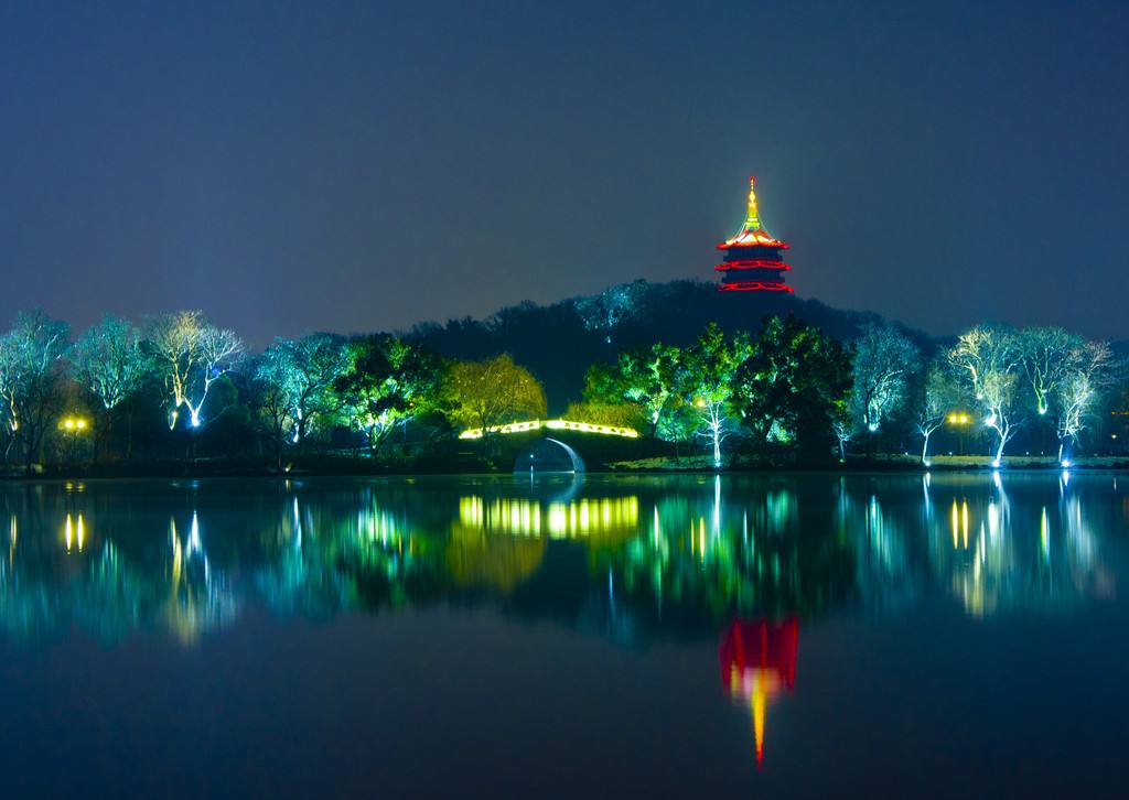 夜景路线有:湖滨-南山路-苏堤-白堤-北山路-湖滨。湖滨这里有音乐喷泉,湖滨、白堤均可看到宝石山夜景,比较漂亮的还有远处的雷峰塔、城隍阁。