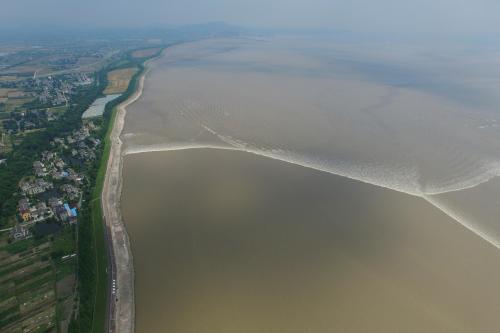 盐官镇西12公里的老盐仓。这里,有一道高9米、长650米的“丁字坝”直插江心,宛如一只力挽狂澜的巨臂。潮水至此,气势已经稍减,但冲到丁字坝头,仍如万头雄狮惊吼跃起,激浪千重。随即潮头转,返窜向塘岸,直向塘顶观潮的人们扑来。身临其境,让人拍案惊奇。