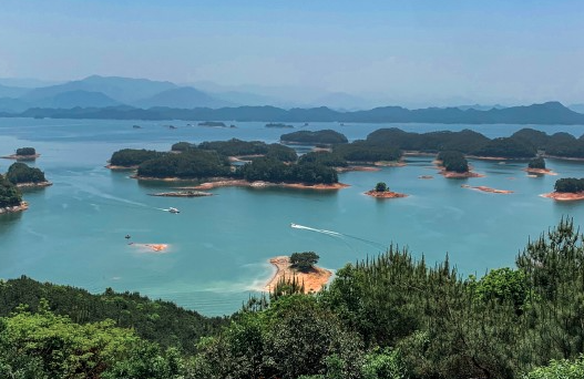 2.千岛湖,即新安江水库,位于浙江省杭州市淳安县境内,小部分连接杭州市建德市西北,是为建新安江水电站拦蓄新安江上游而成的人工湖,1955年始建,1960年建成。距杭州、黄山各150公里,是长江三角洲地区的后花园,景区内碧水呈奇,千岛百姿,自然风光旖旎,生态环境佳绝,因湖内拥有1078座翠岛而得名。千岛湖因其山青、水秀、洞奇、石怪而被誉为“千岛碧水画中游”。