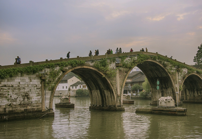 一、拱宸桥拱宸桥,位于浙江省杭州市区大关桥之北,东连丽水路、台州路,西接桥弄街,连小河路,是杭城古桥中最高最长的石拱桥。桥长98米,高16米,桥面中段略窄为5.9米宽,而两端桥堍处有12.2米宽。三孔薄墩联拱驼峰桥,边孔净跨11.9米,中孔15.8米,拱券石厚30厘米,为拱跨的1/52.7和1/39.7中墩厚约1m,合大孔的1/15.8;眉石厚20厘米。采用木桩基础结构,拱券为纵联分节并列砌筑。