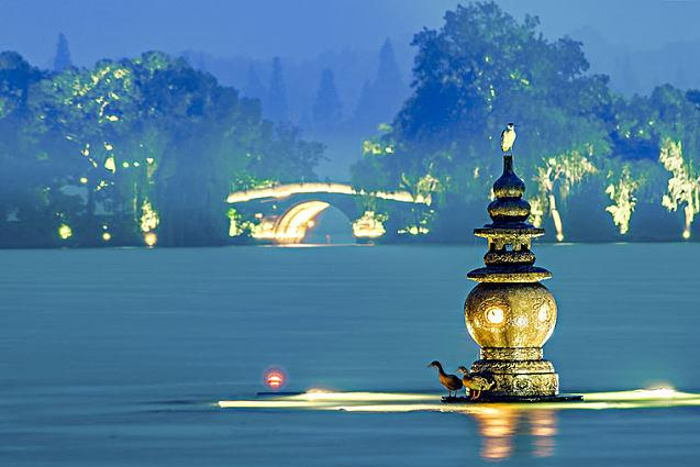 灵隐寺。环绕西湖15公里,既可骑公共自行车也可漫步湖岸,饱览山水美景。登上西湖游船,畅游三岛绝不会让你失望,千年古刹灵隐寺、雷峰塔都是访客必游之处,秋天的北山路,天空湛蓝,亮黄的梧桐树叶高大茂密。
