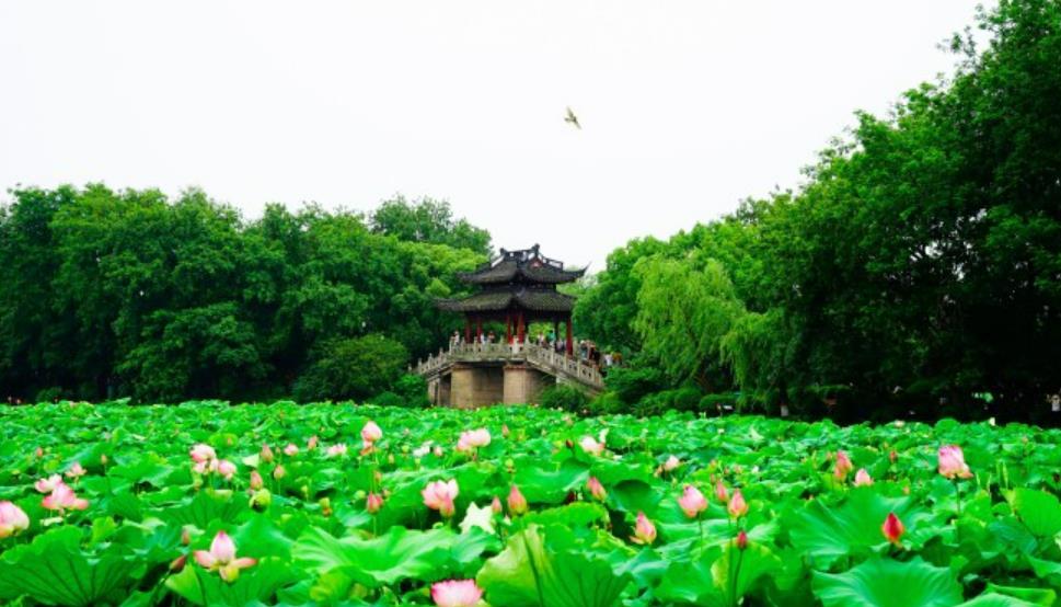 其所在的风荷公园内栽培了上百个品种的荷花,夏季显出分外迷人的吸引力。南宋时,此地有一酿酒作坊,取溪水造曲酒,每当夏日风起,酒香荷香沁人心脾,故称“曲院风荷”。莲叶田田,菡萏妖娆,水面上架设了造型各异的小桥,人从桥上过,如在荷中行。