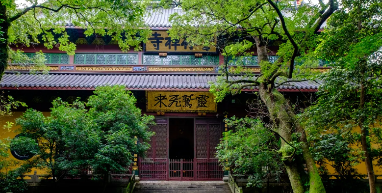 它位于浙江省杭州市的西湖西北面,通常也把它归属于西湖景区。它坐落在飞来峰与北高峰之间灵隐山麓中,背靠北高峰,面朝飞来峰,林木耸秀,是一处古朴幽静、景色宜人的游览胜地。此寺始建于东晋咸和元年(326年),距今已有1670多年的历史,为中国佛教禅宗十大古刹之一。这里自创建以来,毁建10余次,经过整修,成了现在的规模,占地面积约87000平方米,有各种塔林与佛教建筑。