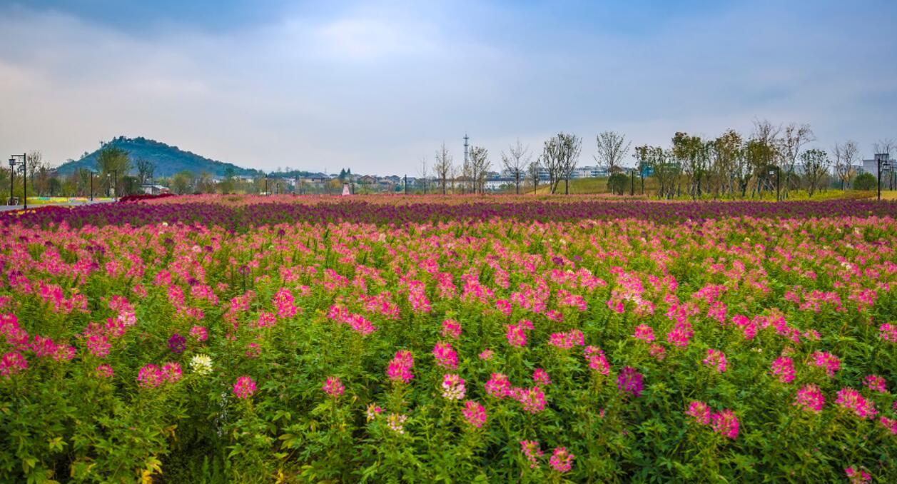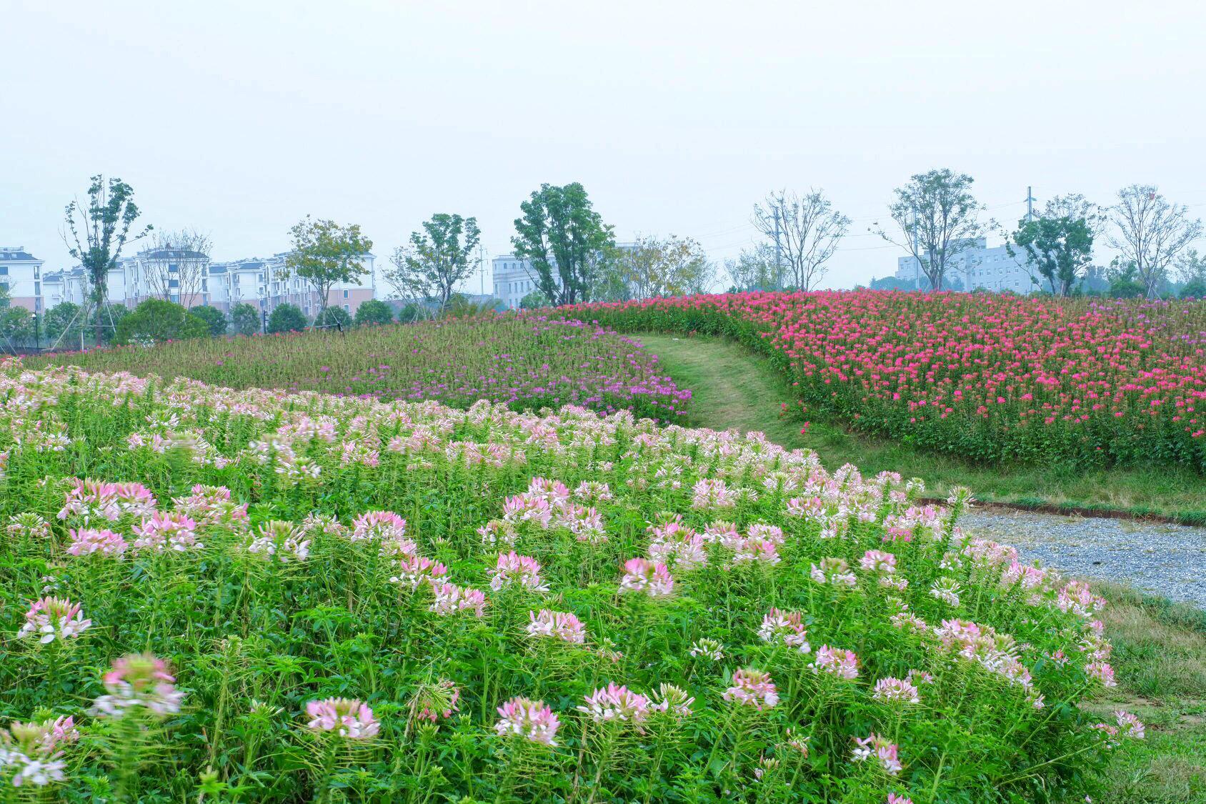 景区所处位置地势平坦、三面环山,里面种植了向日葵、千日红、香莲花、波斯菊、美女樱、马鞭草等多个品种的花卉。为了让花海达到与远处群山环环相连、层层推进的效果,花海部分特意筑起了几米高的低丘缓坡,绵延的缓坡近处与花、溪水衔接,远处与周边的群山遥相呼应、两两相望。站在缓坡之上,花海的一草一木、一石一景尽收眼底。